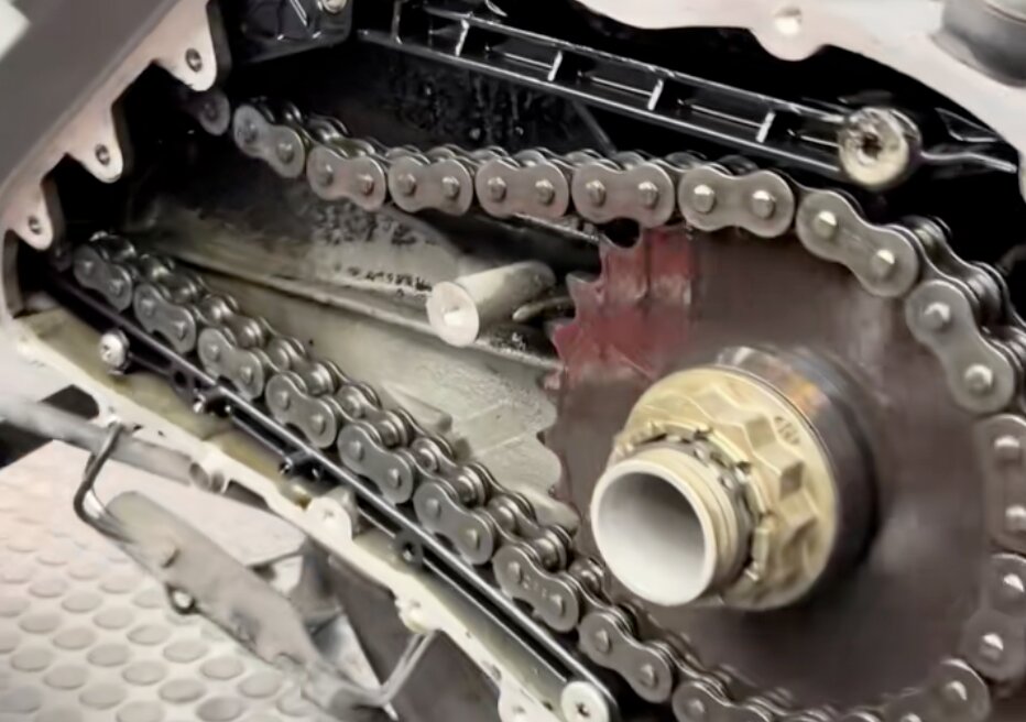 En la C 650 GT, BMW no plantea un sistema de tensado tradicional. En su lugar, utiliza patines de diferentes grosores que permiten ir corrigiendo la tensión a medida que la cadena se va estirando con el uso.