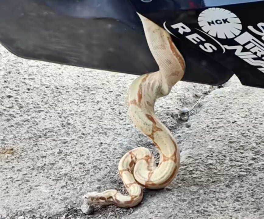 Según relatan desde el taller, el vehículo había llegado para una revisión rutinaria. Mientras la moto se encontraba en el elevador, uno de los técnicos notó un movimiento extraño en la parte inferior del carenado. Lo que en un principio parecía un simple cable suelto o una goma, pronto reveló su verdadera naturaleza: una serpiente de gran tamaño y vivos colores, que se deslizaba lentamente hacia el exterior.