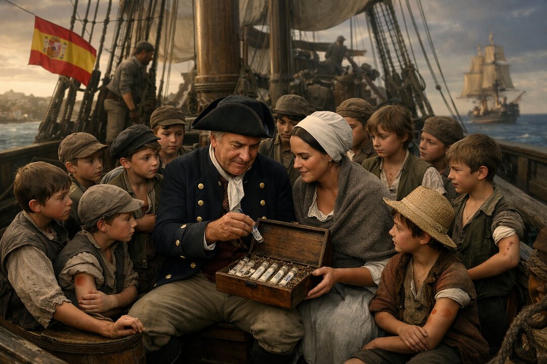 El problema al que se enfrentaba Balmis parecía imposible de resolver. La vacuna de la viruela no podía conservarse más allá de unos pocos días fuera del cuerpo humano, y el viaje hasta América duraba semanas. Sin refrigeración, sin tecnología, sin más recursos que la inteligencia y la determinación, ideó una solución tan brillante como profundamente humana. La vacuna se mantendría viva dentro de los propios niños.